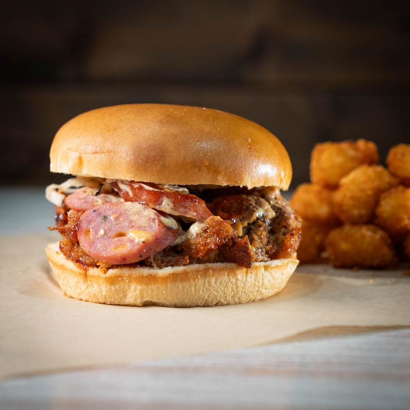 Pulled pork, bacon, smoked sausage, caramelized onions, Bama sauce.